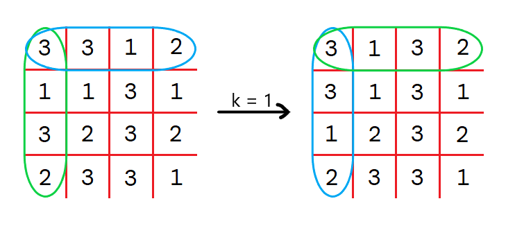 Например, для \(n = 4\) и \(k = 3\) матрица будет преобразована следующим образом: