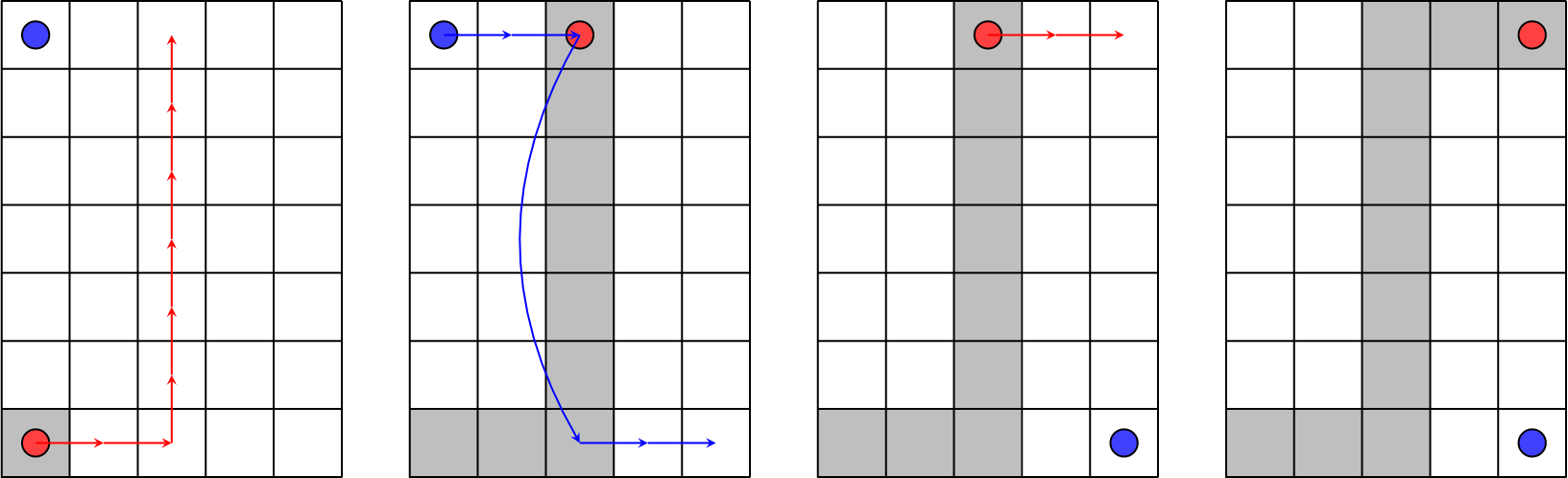 Они решили разделиться: Сереже надо попасть из верхней левой клетки (клетка с координатами \((1, 1)\)) в нижнюю правую (клетка с координатами \((n, m)\)), а Марго из нижней левой (клетка с координатами \((n, 1)\)) в верхнюю правую (клетка с координатами \((1, m)\)).