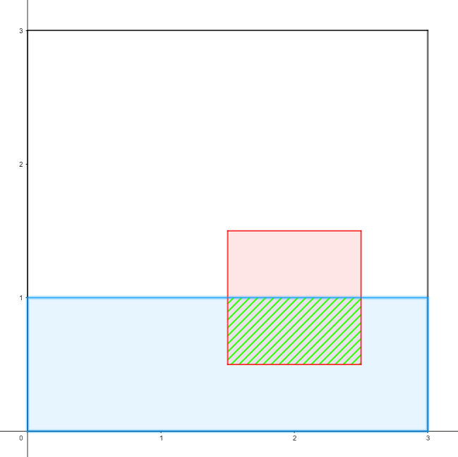 В первом тесте из условия инопланетяне отравили квадрат с вершинами в точках с координатами \((1.5, 0.5)\), \((1.5, 1.5)\), \((2.5, 1.5)\), \((2.5, 0.5)\). На картинке он отмечен красным цветом, многоугольник, выбранный в запросе — синим, а их пересечение — зелёным.
