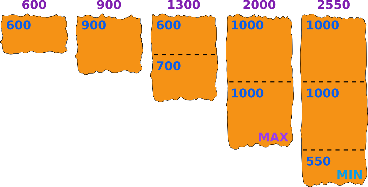 В третьем наборе один из возможных вариантов разрезов: \(600,\ 900,\ (600 | 700),\ (1000 | 1000),\ (1000 | 1000 | 550)\). Этот вариант можно увидеть на изображении ниже. Максимальный кусок имеет размер \(1000\) и менее чем в \(2\) раза превосходит минимальный размером \(550\). Произведено \(4\) действия, можно показать, что это минимальное количество действий.