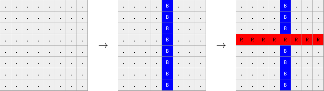 В матрице размером \(8 \times 8\) некоторые строки были покрашены в красный цвет и некоторые столбцы — в синий в некотором порядке. Покраски проводились последовательно, одна за другой. Когда осуществлялась очередная покраска она красила все клетки, по которым проходила.