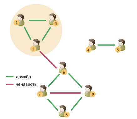 - все приглашенные на вечеринку должны быть связаны с ним дружбой напрямую или через цепь общих друзей произвольной длины. Будем говорить, что люди a1 и ap связаны цепью общих друзей, если существует последовательность людей a2, a3, ..., ap - 1 такая, что все пары людей ai и ai + 1 (1 ≤ i < p) — друзья.