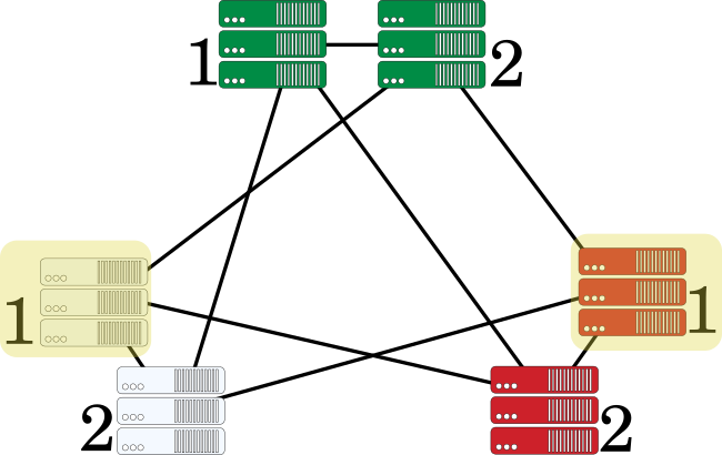 - For each server \(s\) in the old data center, the new data center contains two servers \(s_1\) and \(s_2\) of the same color as \(s\). A wire is placed connecting the two servers \(s_1\) and \(s_2\).