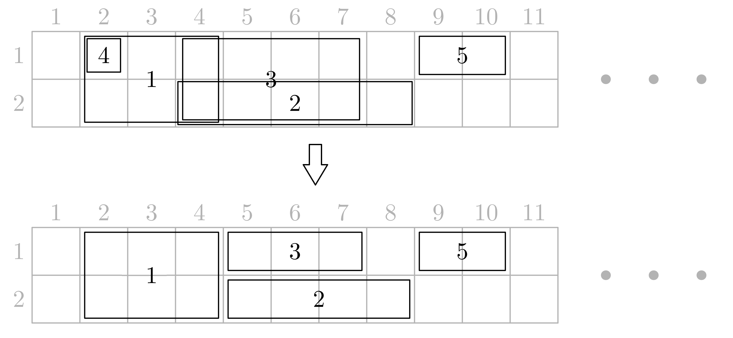 Рисунок для первого набора входных данных. Сверху изображены данные прямоугольники, снизу — изменённые. Прямоугольник номер \(4\) был удалён. Выходные данные