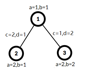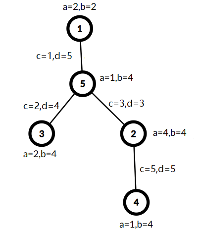 Вам дано дерево \(T\), состоящее из \(n\) вершин. Каждая вершина имеет значения \(a_i\) и \(b_i\), а каждое ребро имеет значения \(c_j\) и \(d_j\).
