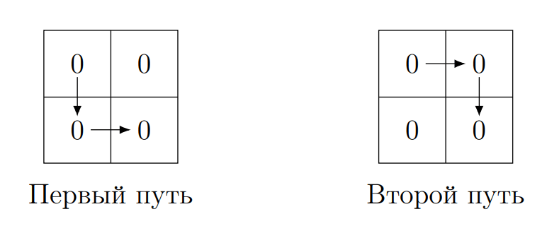 В первом наборе входных данных лексикографически наименьшей строкой является \(\mathtt{000}\). Есть два пути, движение по которым даст эту строку: