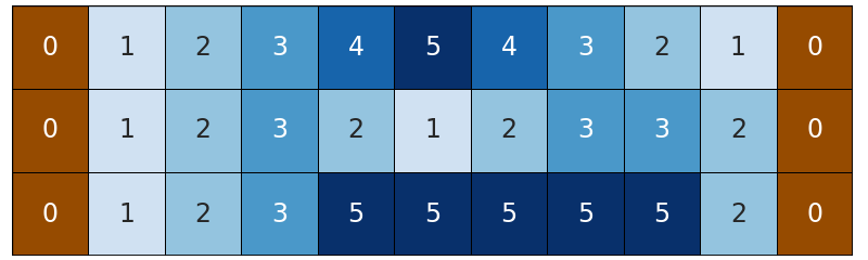 Это не вид сверху, а вид сбоку: серые ячейки — сам мост, белые ячейки — пустые, черные ячейки — опоры, синие ячейки — вода, коричневые ячейки — дно реки. Во втором наборе мост выгоднее всего построить на второй и третьей строках. Опоры будут стоять в клетках \((2, 3)\), \((3, 2)\) и на берегах.