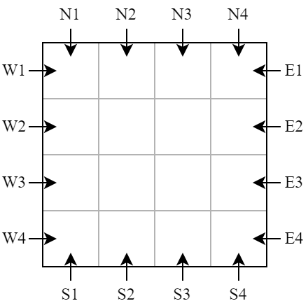 If \(k > 0\), then output \(k\) space-separated strings representing the location of the laser. Each string consists of a character followed without any space by an integer. The character represents the side of the grid, which could be N, S, E, or W if you put the laser on the north, south, east, or west side of the grid, respectively. The integer represents the row/column number. You can output the strings in any order.