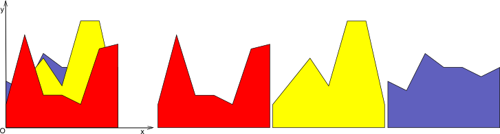 Слева изображено как выглядит украшение, справа — кусочки бумаги, из которых оно состоит. Кусочек с номером 1 (красный на рисунке) является самым внешним (его мы видим полностью), кусочек с номером 2 (желтый на рисунке) следует за ним (его мы видим уже не полностью, поскольку часть его закрыта первым кусочком) и так далее. Программисты — ребята любознательные, поэтому как только мы повесили украшение на елку, нам сразу же стало интересно: какая площадь от каждого кусочка видна зрителю?