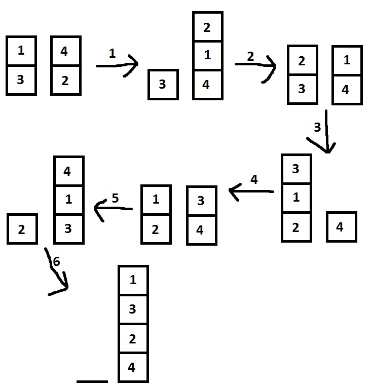 Правила игры следующие. На каждом ходу происходит сражение. Каждый игрок берет карту с вершины своей стопки и кладет на стол. Тот, у кого значение карты больше, выигрывает в этом сражении, берет обе карты со стола и кладет в низ своей стопки. Точнее говоря, сперва он берет карту противника и кладет в низ своей стопки, затем кладет свою карту в низ своей стопки. Если после какого-то хода стопка одного игрока становится пустой, то он проигрывает, а другой игрок побеждает.