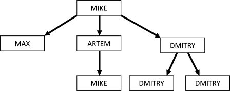 Например, строка MIKE:MAX.,ARTEM:MIKE..,DMITRY:DMITRY.,DMITRY... является корректной записью структуры корпорации, в которой директор MIKE имеет подчиненных MAX, ARTEM и DMITRY. ARTEM имеет подчиненного, которого зовут MIKE, точно так же как и его начальника, а двоих подчиненных DMITRY зовут DMITRY, как и его самого.
