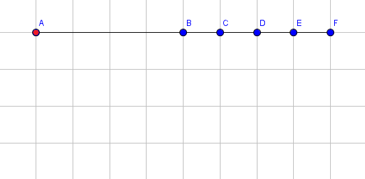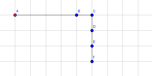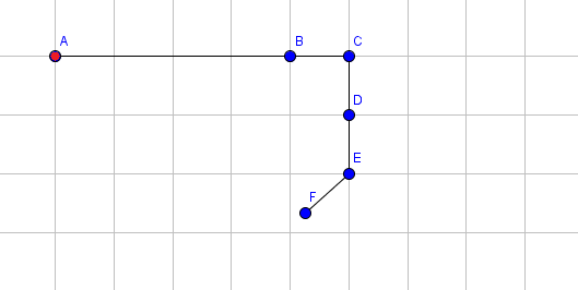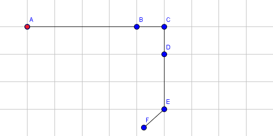 Следующие картинки иллюстрируют пример и показывают состояние руки после каждой операции. Координаты точки F выведены после применения каждой операции. Для простоты мы показываем только синие концы отрезка (за исключением красного конца первого). Например, точка, помеченная В, является синим концом отрезка 1, а также красным концом отрезка 2.