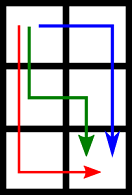 Каждая комната содержит четыре двери (за исключением комнат на границе лабиринта), по одной на каждой из ее стен, так что две соседние по стене комнаты делят одну и ту же дверь. Некоторые из дверей заперты, и проходить через них запрещено. К примеру, если дверь между (i, j) и (i, j + 1) заперта, то пройти из (i, j) в (i, j + 1) нельзя. Также между комнатами можно перемещаться только вниз (из комнаты (i, j) в комнату (i + 1, j)) или вправо (из комнаты (i, j) в комнату (i, j + 1)), если соответствующая дверь не заперта.