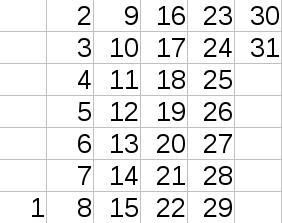 Петя решил сделать календарь на текущий месяц. Для этого он рисует таблицу, в которой столбцы будут соответствовать неделям (неделя — семь последовательных дней, начинающиеся в понедельник и заканчивающиеся в воскресение), строки — дням недели, а в клетках таблицы будут записаны числа месяца. Например, календарь на январь 2017-го года выглядит так:
