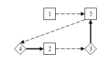Рисунок ниже соответствует первому примеру. На нем ромбы обозначают мальчиков, а квадраты — девочек. Стрелки ведут от ученика к его лучшему другу, жирные (не пунктирные) обозначают пары из ответа.