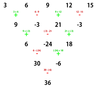 Заметьте, что, если она закончила предыдущий ряд, вычислив сумму чисел, то она должна начать новый ряд вычитанием, и наоборот.