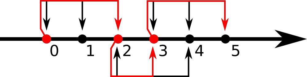 Свин с помощью первого телепорта от своего дома (точки 0) добирается до точки 2, дальше с помощью второго от точки 2 до точки 3, и с помощью третьего от точки 3 до точки 5, где и живет друг.