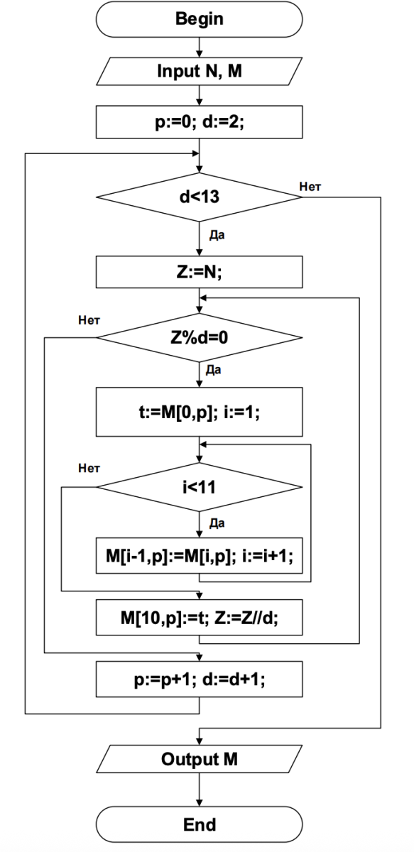 Дана блок-схема алгоритма, обрабатывающего целочисленную матрицу, размером 11 на 11 элементов: