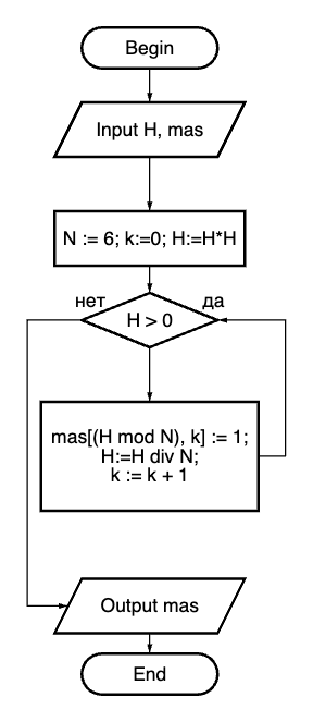 Дана блок-схема алгоритма, обрабатывающего двумерный массив. На вход подается массив mas, размером 6x9 элементов, инициализированный нулями и целое положительное число H. Нумерация элементов массива начинается с [0,0].