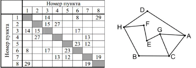 Так как таблицу и схему рисовали независимо друг от друга, нумерация населённых пунктов в таблице никак не связана с буквенными обозначениями на графе. Определите, какова сумма протяжённостей дорог из пункта G в пункт E и из пункта F в пункт H.