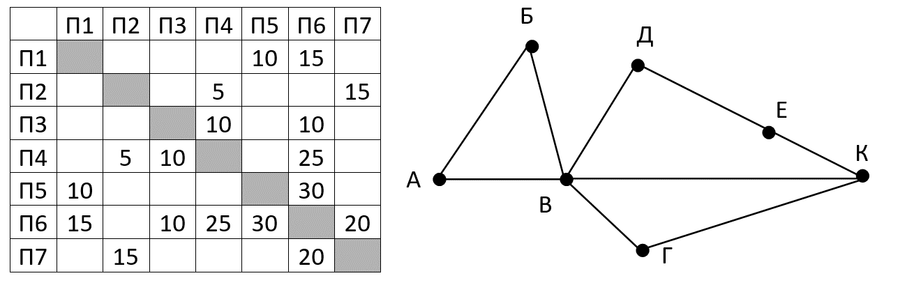 (М.В. Кузнецова) На рисунке справа схема дорог между некоторыми объектами изображена в виде графа, в таблице содержатся сведения о длинах этих дорог (в километрах). Так как таблицу и схему рисовали независимо друг от друга, то нумерация объектов в таблице никак не связана с буквенными обозначениями на графе. Определите длину кратчайшего пути между пунктами В и Е. Передвигаться можно только по указанным дорогам.