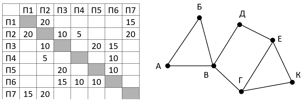 (М.В. Кузнецова) На рисунке справа схема дорог Н-ского района изображена в виде графа, в таблице содержатся сведения о длинах этих дорог (в километрах). Так как таблицу и схему рисовали независимо друг от друга, то нумерация населённых пунктов в таблице никак не связана с буквенными обозначениями на графе. Определите длину кратчайшего пути между пунктами В и К. Передвигаться можно только по указанным дорогам.