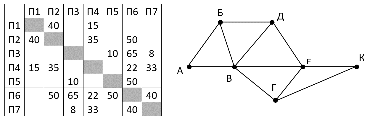 На рисунке справа схема дорог Н-ского района изображена в виде графа, в таблице содержатся сведения о длинах этих дорог (в километрах). Так как таблицу и схему рисовали независимо друг от друга, то нумерация населённых пунктов в таблице никак не связана с буквенными обозначениями на графе. Определите длину кратчайшего пути между пунктами Б и Д. Передвигаться можно только по указанным дорогам.