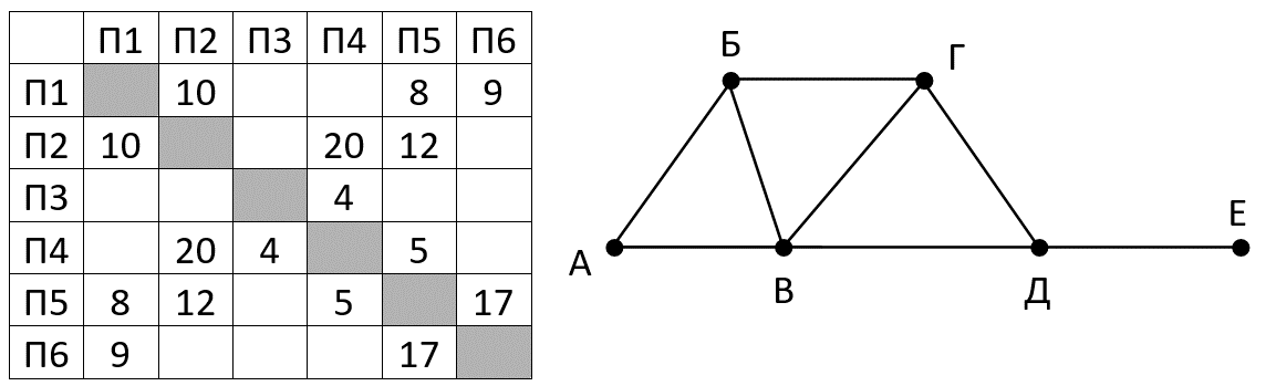 На рисунке справа схема дорог Н-ского района изображена в виде графа, в таблице содержатся сведения о длинах этих дорог (в километрах). Так как таблицу и схему рисовали независимо друг от друга, то нумерация населённых пунктов в таблице никак не связана с буквенными обозначениями на графе. Определите длину кратчайшего маршрута между пунктами Г и Д. Передвигаться можно только по указанным дорогам.