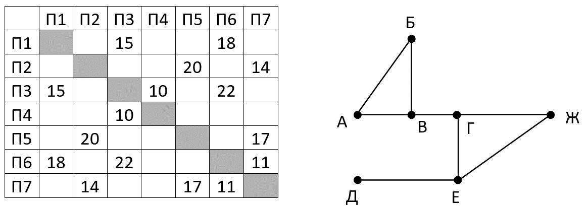 На рисунке справа схема дорог Н-ского района изображена в виде графа, в таблице содержатся сведения о длинах этих дорог (в километрах). Так как таблицу и схему рисовали независимо друг от друга, то нумерация населённых пунктов в таблице никак не связана с буквенными обозначениями на графе. Определите длину дороги между пунктами В и Г. Передвигаться можно только по указанным дорогам.