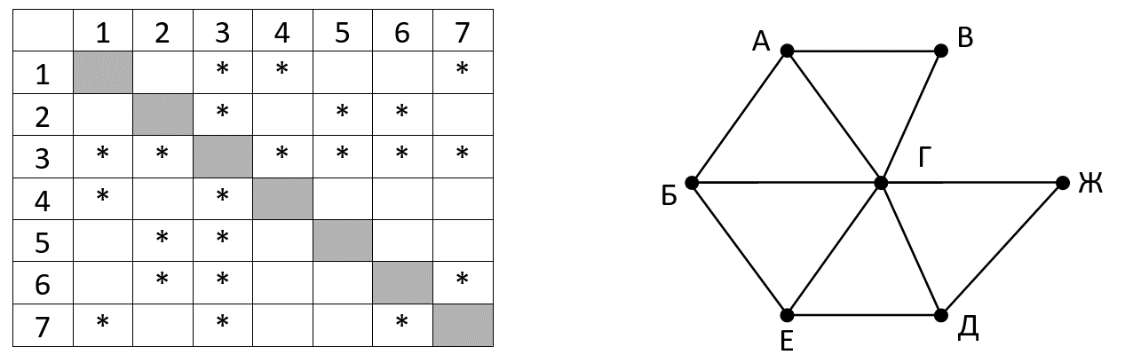(Досрочный ЕГЭ-2018) На рисунке слева изображена схема дорог Н-ского района, в таблице звёздочкой обозначено наличие дороги из одного населённого пункта в другой. Отсутствие звёздочки означает, что такой дороги нет. Определите, какие номера населённых пунктов в таблице могут соответствовать населённым пунктам Б и Е на схеме. В ответе запишите эти два номера в возрастающем порядке без пробелов и знаков препинания.