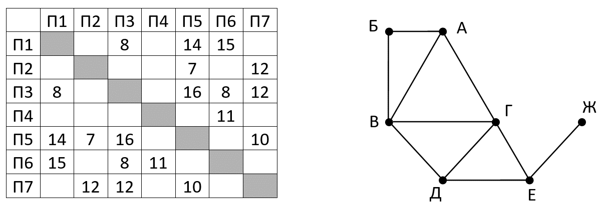 На рисунке справа схема дорог Н-ского района изображена в виде графа, в таблице содержатся сведения о длинах этих дорог (в километрах). Так как таблицу и схему рисовали независимо друг от друга, то нумерация населённых пунктов в таблице никак не связана с буквенными обозначениями на графе. Укажите кратчайший путь из пункта Б в пункт Ж. В ответе перечислите все населённые пункты, через которые проходит путь. Например, путь из Г в В через А и Б записывается как ГАБВ.