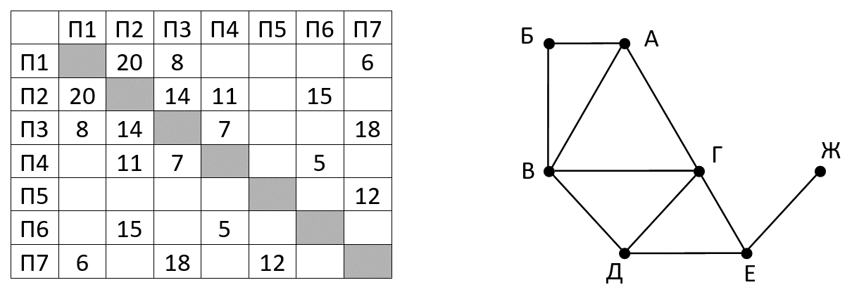 На рисунке справа схема дорог Н-ского района изображена в виде графа, в таблице содержатся сведения о длинах этих дорог (в километрах). Так как таблицу и схему рисовали независимо друг от друга, то нумерация населённых пунктов в таблице никак не связана с буквенными обозначениями на графе. Укажите кратчайший путь из пункта Б в пункт Ж. В ответе перечислите все населённые пункты, через которые проходит путь. Например, путь из Г в В через А и Б записывается как ГАБВ.