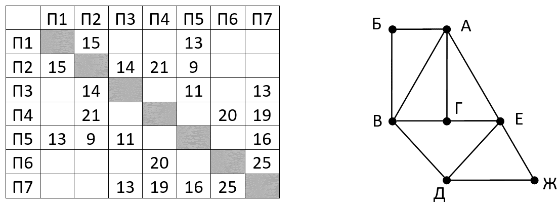 На рисунке справа схема дорог Н-ского района изображена в виде графа, в таблице содержатся сведения о длинах этих дорог (в километрах). Так как таблицу и схему рисовали независимо друг от друга, то нумерация населённых пунктов в таблице никак не связана с буквенными обозначениями на графе. Определите, в какой пункт ведёт самая короткая дорога из пункта А. Запишите в ответе одну заглавную букву.