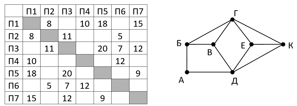На рисунке справа схема дорог Н-ского района изображена в виде графа, в таблице содержатся сведения о длинах этих дорог (в километрах). Так как таблицу и схему рисовали независимо друг от друга, то нумерация населённых пунктов в таблице никак не связана с буквенными обозначениями на графе. Определите длину кратчайшего пути из пункта А в пункт В, если передвигаться можно только по указанным дорогам. В ответе запишите целое число – длину пути в километрах.