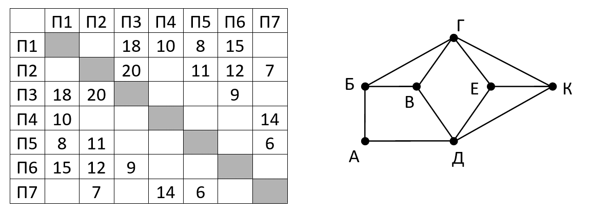 На рисунке справа схема дорог Н-ского района изображена в виде графа, в таблице содержатся сведения о длинах этих дорог (в километрах). Так как таблицу и схему рисовали независимо друг от друга, то нумерация населённых пунктов в таблице никак не связана с буквенными обозначениями на графе. Определите длину кратчайшего пути из пункта А в пункт В, если передвигаться можно только по указанным дорогам. В ответе запишите целое число – длину пути в километрах.