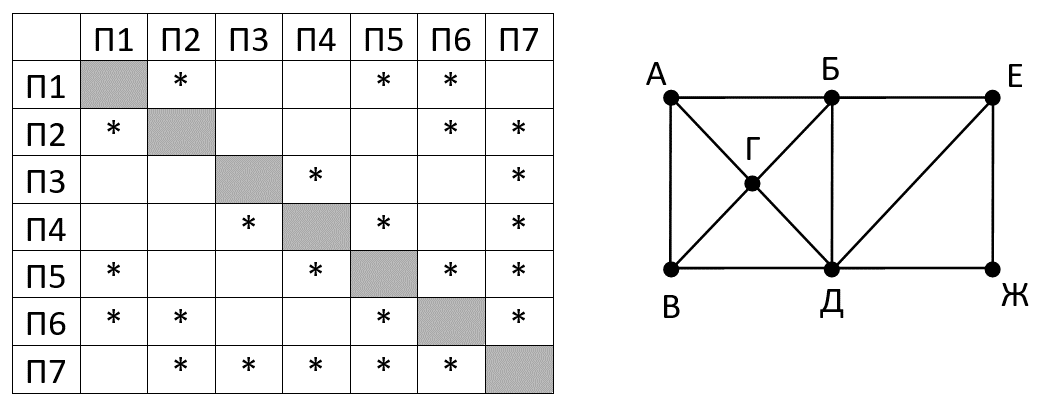 На рисунке справа схема дорог Н-ского района изображена в виде графа, в таблице звёздочками обозначено наличие дорог. Так как таблицу и схему рисовали независимо друг от друга, то нумерация населённых пунктов в таблице никак не связана с буквенными обозначениями на графе. Выпишите последовательно, без пробелов и знаков препинания, указанные на графе буквенные обозначения пунктов от П1 до П7: сначала букву, соответствующую П1, затем букву, соответствующую П2, и т. д.