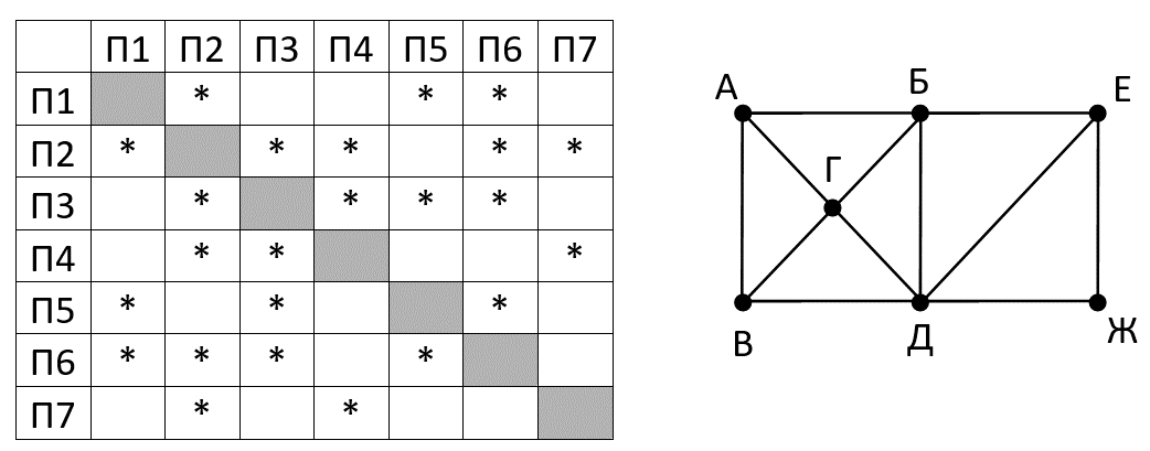На рисунке справа схема дорог Н-ского района изображена в виде графа, в таблице звёздочками обозначено наличие дорог. Так как таблицу и схему рисовали независимо друг от друга, то нумерация населённых пунктов в таблице никак не связана с буквенными обозначениями на графе. Выпишите последовательно, без пробелов и знаков препинания, указанные на графе буквенные обозначения пунктов от П1 до П7: сначала букву, соответствующую П1, затем букву, соответствующую П2, и т. д.