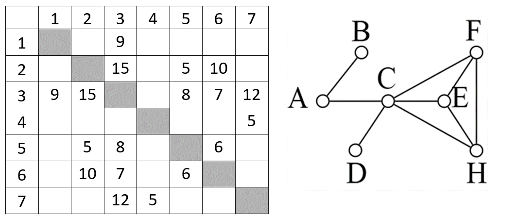 (Е. Джобс) На рисунке справа схема дорог Н-ского района изображена в виде графа, в таблице приведены длины дорог между пунктами. Так как таблицу и схему рисовали независимо друг от друга, то нумерация населённых пунктов в таблице никак не связана с буквенными обозначениями на графе. Найдите длину кратчайшего маршрута из А в Е, если известно, что самая длинная дорога из С ведет в Е.
