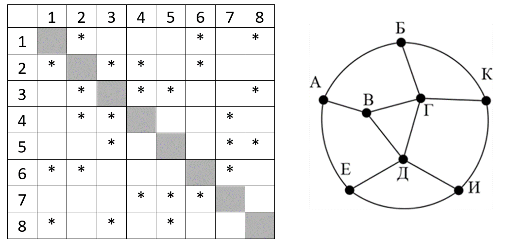 (Е. Джобс) На рисунке справа схема дорог Н-ского района изображена в виде графа, в таблице звёздочками обозначено наличие дорог. Так как таблицу и схему рисовали независимо друг от друга, то нумерация населённых пунктов в таблице никак не связана с буквенными обозначениями на графе. Определите, какие номера населённых пунктов в таблице могут соответствовать населённым пунктам И и К на схеме. В ответе запишите эти два номера в возрастающем порядке без разделителей.