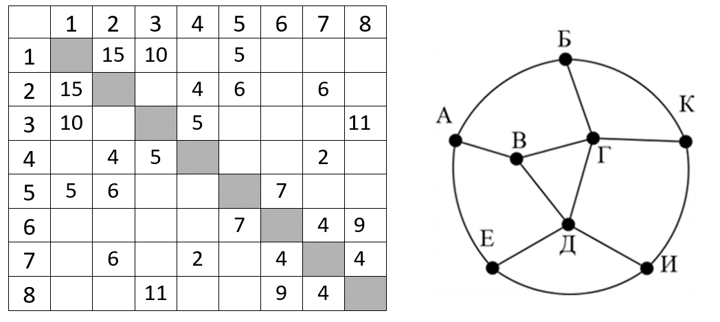 (Е. Джобс) На рисунке справа схема дорог Н-ского района изображена в виде графа, в таблице обозначены длины дорог между населёнными пунктами в километрах. Так как таблицу и схему рисовали независимо друг от друга, то нумерация населённых пунктов в таблице никак не связана с буквенными обозначениями на графе. Определите длину кратчайшего пути из пункта Б в пункт Е, если передвигаться можно только по указанным дорогам. В ответе запишите целое число – длину пути в километрах.