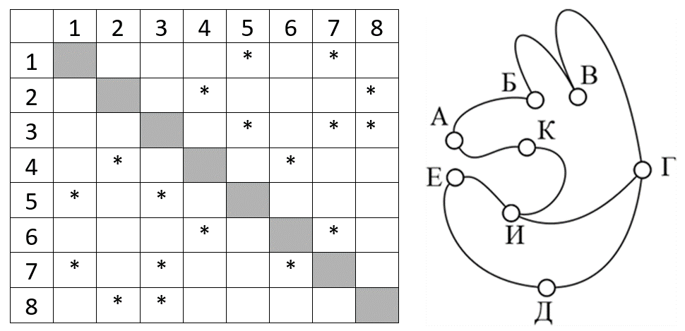 (Е. Джобс) На рисунке справа схема дорог Н-ского района изображена в виде графа, в таблице звёздочками обозначено наличие дорог. Так как таблицу и схему рисовали независимо друг от друга, то нумерация населённых пунктов в таблице никак не связана с буквенными обозначениями на графе. Определите номера пунктов, которые соответствуют городам А и Б. В ответе запишите найденные номера в порядке возрастания без разделителей.