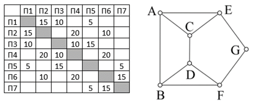 (Е. Джобс) На рисунке справа схема дорог Н-ского района изображена в виде графа, в таблице числами обозначены длины дорог в километрах. Так как таблицу и схему рисовали независимо друг от друга, то нумерация населённых пунктов в таблице никак не связана с буквенными обозначениями на графе. Найдите номера пунктов в таблице, соответствующие пунктам А и В на схеме, если известно, что дорога между А и В длиной 10 километров. В качестве ответа запишите без разделителей два числа – номера пунктов в таблице, соответствующие пунктам А и В на схеме, в порядке возрастания.
