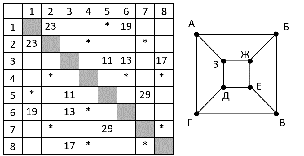 *(А. Богданов) На рисунке схема коммуникаций Н-ского астероида изображена в виде графа, в таблице содержатся сведения о протяжённости некоторых «дорог» между восьми порталов. Для остальных «дорог» длина неизвестна и обозначена «звездочкой». Так как таблицу и схему рисовали независимо друг от друга, то нумерация порталов в таблице никак не связана с буквенными обозначениями на графе. Определите минимальную известную протяжённость пути из пункта А в пункт Е, если известно, что путь состоит ровно из трех «дорог». В ответе запишите целое число.