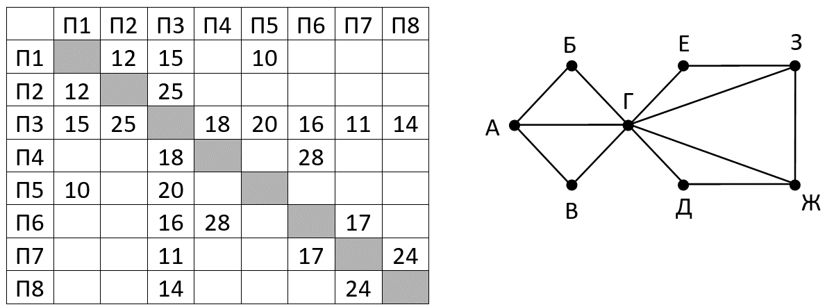 На рисунке схема дорог Н-ского района изображена в виде графа, в таблице содержатся сведения о длине этих дорог в километрах. Так как таблицу и схему рисовали независимо друг от друга, нумерация населённых пунктов в таблице никак не связана с буквенными обозначениями на графе. Определите длину более длинной из дорог ЕЗ и ДЖ. В ответе запишите целое число.
