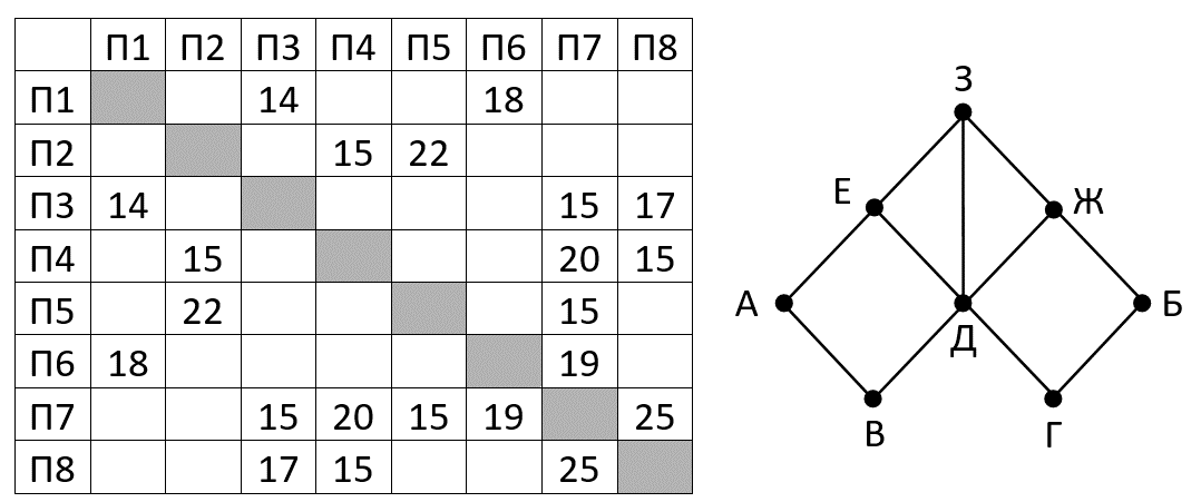 На рисунке схема дорог Н-ского района изображена в виде графа, в таблице содержатся сведения о длине этих дорог в километрах. Так как таблицу и схему рисовали независимо друг от друга, нумерация населённых пунктов в таблице никак не связана с буквенными обозначениями на графе. Известно, что длина дороги ЗЕ равна 15 км. Определите длину дороги БГ. В ответе запишите целое число – длину дороги в километрах.