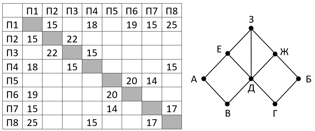 На рисунке схема дорог Н-ского района изображена в виде графа, в таблице содержатся сведения о длине этих дорог в километрах. Так как таблицу и схему рисовали независимо друг от друга, нумерация населённых пунктов в таблице никак не связана с буквенными обозначениями на графе. Известно, что длина дороги ЗЕ равна 15 км. Определите длину дороги БГ. В ответе запишите целое число – длину дороги в километрах.