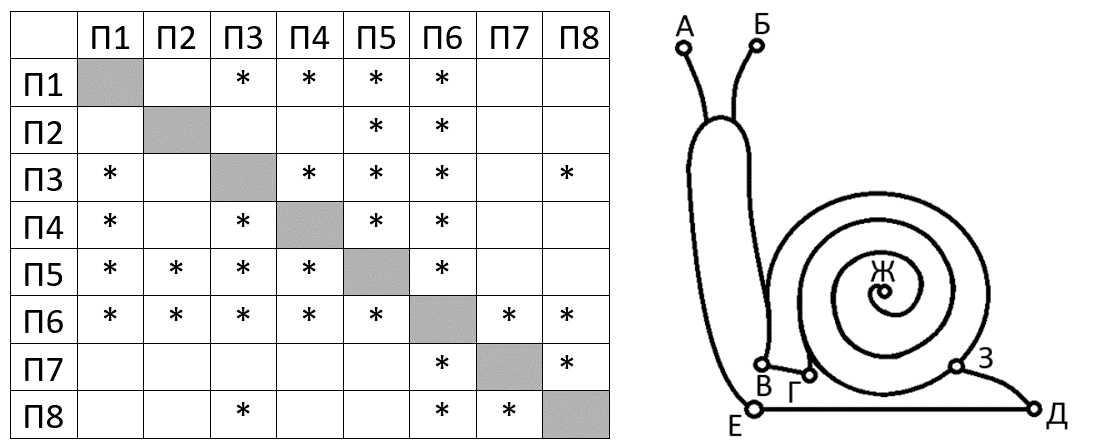 (Е. Усов) На рисунке схема дорог Н-ского района изображена в виде графа, в таблице звёздочка обозначает наличие дороги между населёнными пунктами. Так как таблицу и схему рисовали независимо друг от друга, то нумерация населённых пунктов в таблице никак не связана с буквенными обозначениями на графе. Определите номера пунктов В и Ж, найденные номера запишите в порядке возрастания без разделителей.