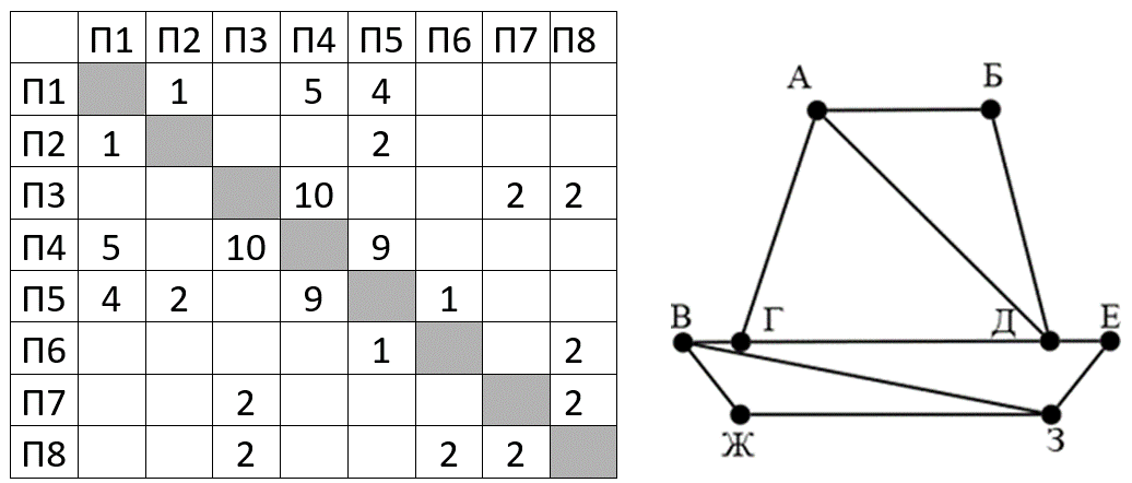 (Е. Джобс) На рисунке справа схема дорог Н-ского района изображена в виде графа, в таблице содержатся сведения о длинах этих дорог (в километрах). Так как таблицу и схему рисовали независимо друг от друга, то нумерация населённых пунктов в таблице никак не связана с буквенными обозначениями на графе. В таблице в левом столбце указаны номера пунктов, откуда совершается движение, в первой строке – куда. Определите длину кратчайшего маршрута между пунктами Г и З. Передвигаться можно только по указанным дорогам.