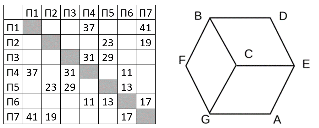 (А. Богданов) На рисунке справа схема дорог Н-ского района изображена в виде графа, в таблице содержатся сведения о длинах этих дорог (в километрах). Так как таблицу и схему рисовали независимо друг от друга, то нумерация населённых пунктов в таблице никак не связана с буквенными обозначениями на графе. В таблице в левом столбце указаны номера пунктов, откуда совершается движение, в первой строке – куда. Определите сумму длин дорог CB, CG и CE. Передвигаться можно только по указанным дорогам.