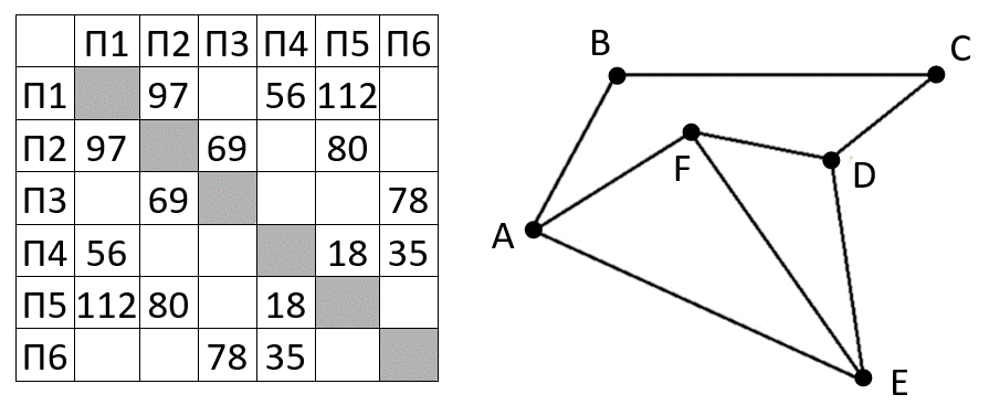 (Д. Статный) На рисунке справа схема дорог Н-ского района изображена в виде графа, в таблице содержатся сведения о длинах этих дорог (в километрах). Так как таблицу и схему рисовали независимо друг от друга, то нумерация населённых пунктов в таблице никак не связана с буквенными обозначениями на графе. В таблице в левом столбце указаны номера пунктов, откуда совершается движение, в первой строке – куда. Определите минимальную возможную длину пути из пункта E в пункт B. Передвигаться можно только по указанным дорогам.